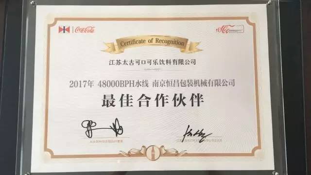 7月4日,江蘇太古可口可樂(lè)有限公司舉行了一場(chǎng)盛大的“新水線(xiàn)運(yùn)營(yíng)揭幕儀式”。作為該項(xiàng)目后段包裝總包商,南京恒昌包裝機(jī)械有限公司獲邀參加儀式,并得到了太古可樂(lè)的高度肯定,獲得“最佳合作伙伴”殊榮!